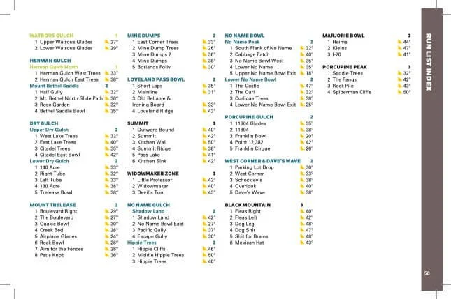 The book and map cover the following zones: Watrous Gulch, Herman Gulch North, Mount Bethel Saddle, Upper & Lower Dry Gulch, Mount Trelease, Mine Dumps, Loveland Pass Bowl, Summit, Widowmaker, Shadowland, Hippie Trees, No Name Peak, Lower No Name Bowl, Porcupine Gulch, West Corner, Dave’s Wave, Black Mountain, Marjorie Bowl, and Porcupine Peak.