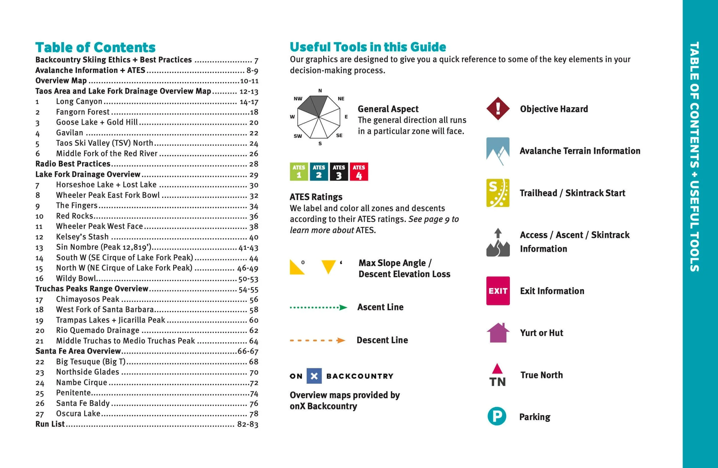 The book covers the following zones: Long Canyon, Fangorn Forest, Goose Lake + Gold Hill, Gavolan, Taos Ski Valley North, Middle Fork of the Red River, Horseshoe Lake + Lost Lake, Wheeler Peak East Fork Bowl, The Fingers, Red Rocks, Wheeler Peak West Face, Sin Nombre (Peak 12,819’), South W, North W, Wildy Bowl, Chimayosos Peak, West Fork of Santa Barbara, Trampas Lakes + Jicarilla Peak, Rio Quemado Drainage, Middle Truchas to Medio Truchas Peak, Big Tesuque, Northside Glades, Nambe Cirque, Penitente, Santa Fe Baldy, Oscura Lake
