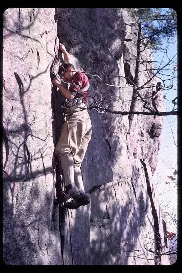 He also pointed out five things of note in the photo: ” 1: Kronhofer kletterschue. Very flexible, with lug soles. About as ill-suited to Devil’s Lake edging as a shoe could be. 2: No chalk. 3: Tie-in via bowline on a coil. 4: Laid rope. 5: Upper belay from top of cliff—we never used a slingshot belay.”