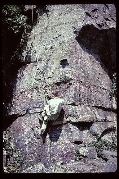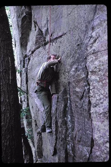 Rich informed us that the climber was Steve Sharnoff, who went on to a career as a nature photographer and, along with his wife Sylvia, did the photography for the prize-winning book Lichens of North America. The route is Darcy’s Wall (5.8), named after climber Ray D’Arcy.