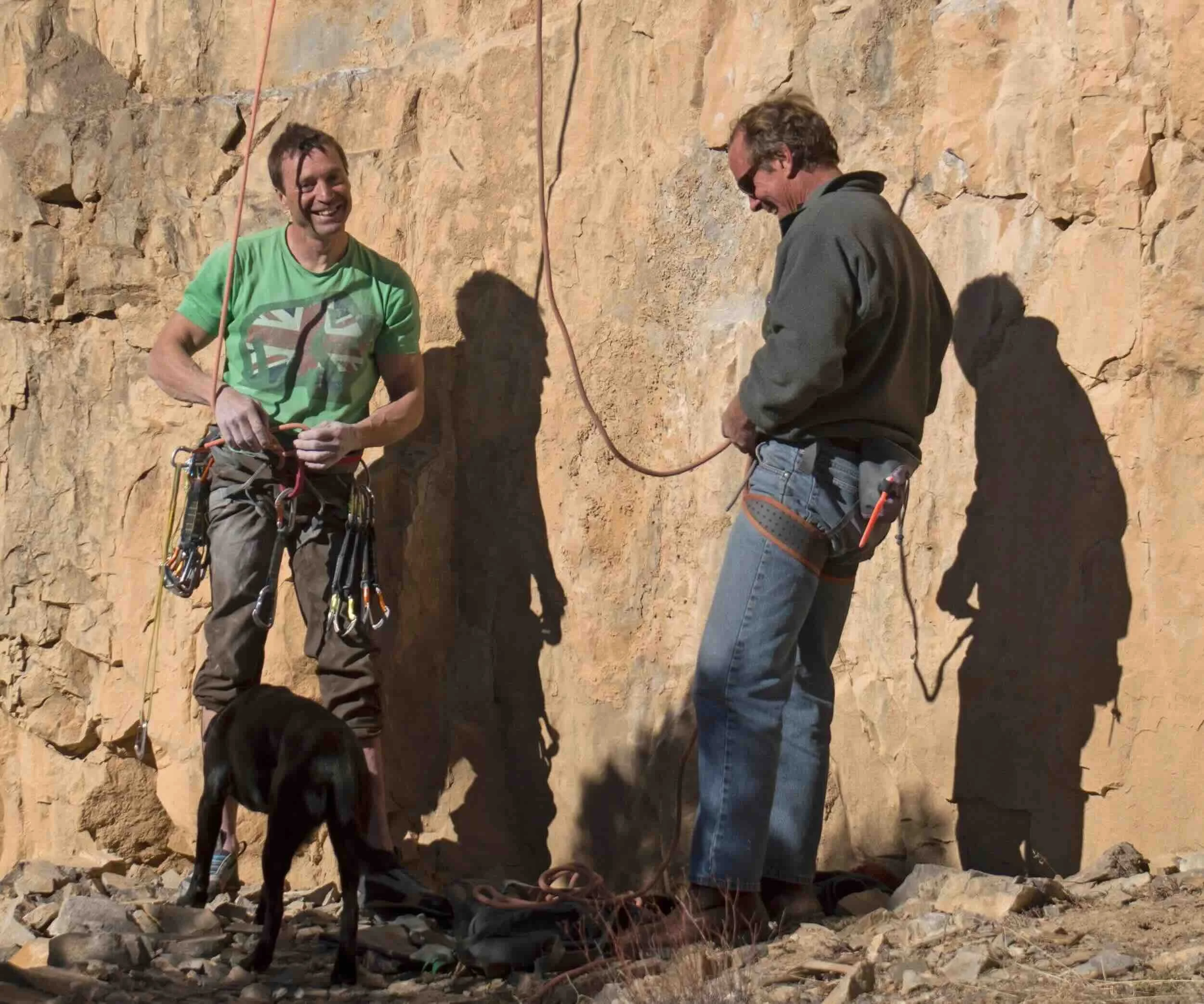 Founder Dave Pegg and current co-owner Jeff Achey roping up at a backyard crag.